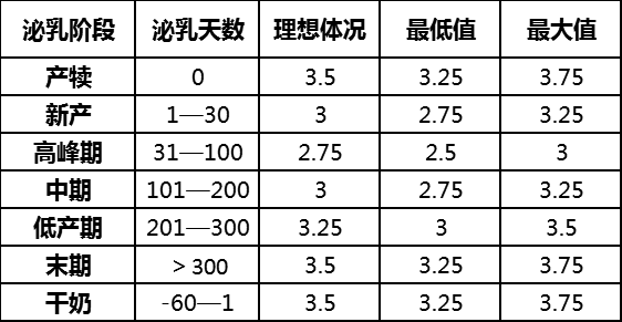 根據以上情況,賓州大學對泌乳牛各階段的體況評分推薦情況如下: